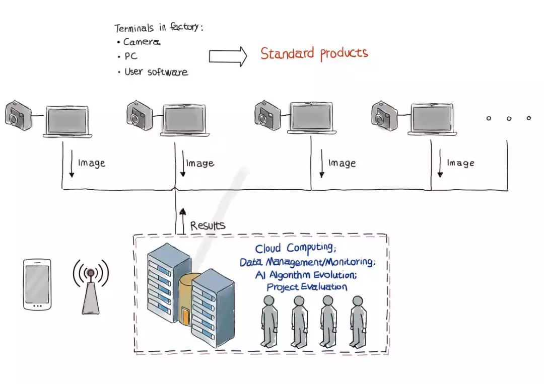 美的工业视觉检测云平台采用了这样的架构:前端图像收集 - 云端大数据分析 - 深度学习模式识别,解决视觉检测环境的非标难题。前端设备收集的图像数据通过 4G 或 Wi-Fi 传输到云端,通过深度学习框架,经由训练获得非标准化视觉检测特征,最终打造出通用化、智能化的瑕疵检测能力。