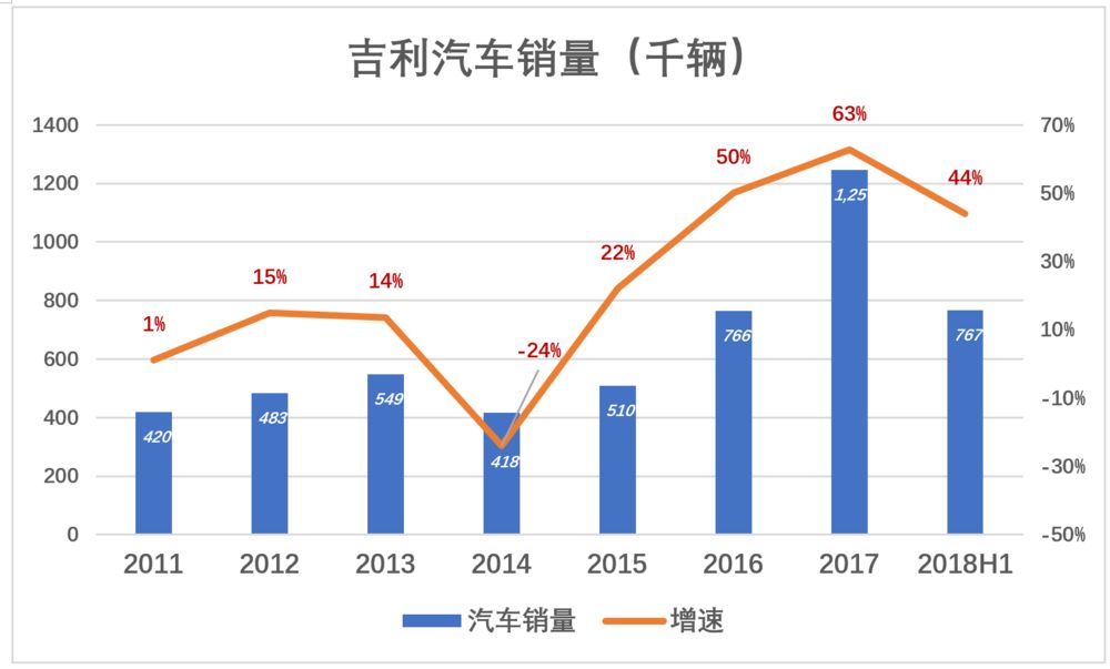 2017年,吉利汽车销量达124.7万辆,同比增长63%,超额完成110万辆的销量目标。年初吉利公布了2018年158万辆的销量目标,较2017年增长27%。