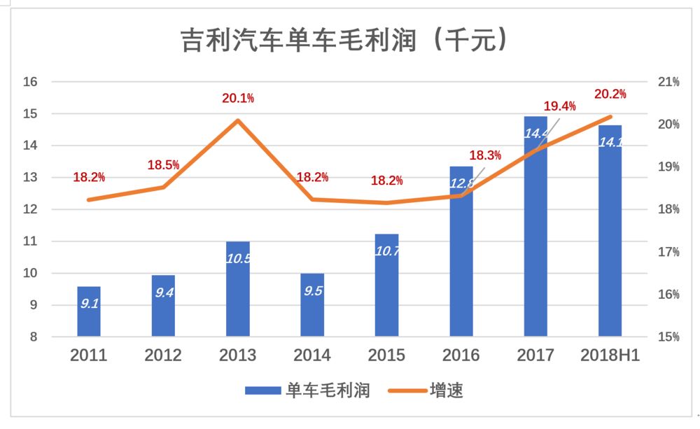 2014年吉利汽车毛利润率较2013年降了2个百分点,每卖一辆车只赚9500元。2017年及2018年H1,毛利润率显著回升,每卖一辆能赚1.4万元。
