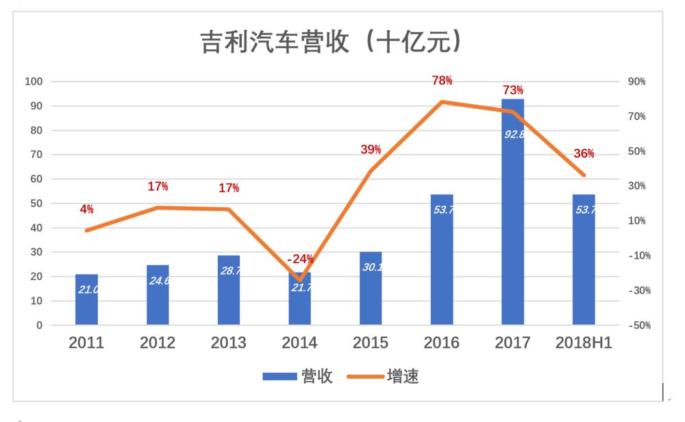 2015年起,吉利汽车营收连续跨越300亿、500亿、900亿三个关口。2017年营收928亿,同比增长73%。