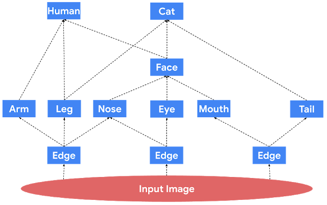 上图展示了图像处理的模块化网络。数据通过蓝色方框所表示的模块从底部传输到顶部。请注意,底层的模块对应于基础对象,如图像中的边缘,而上层的模块对应于较复杂的对象,如人类或猫。另外,在这个假设的模块化网络中,面部模块的输出是通用的,可用于人类和猫模块