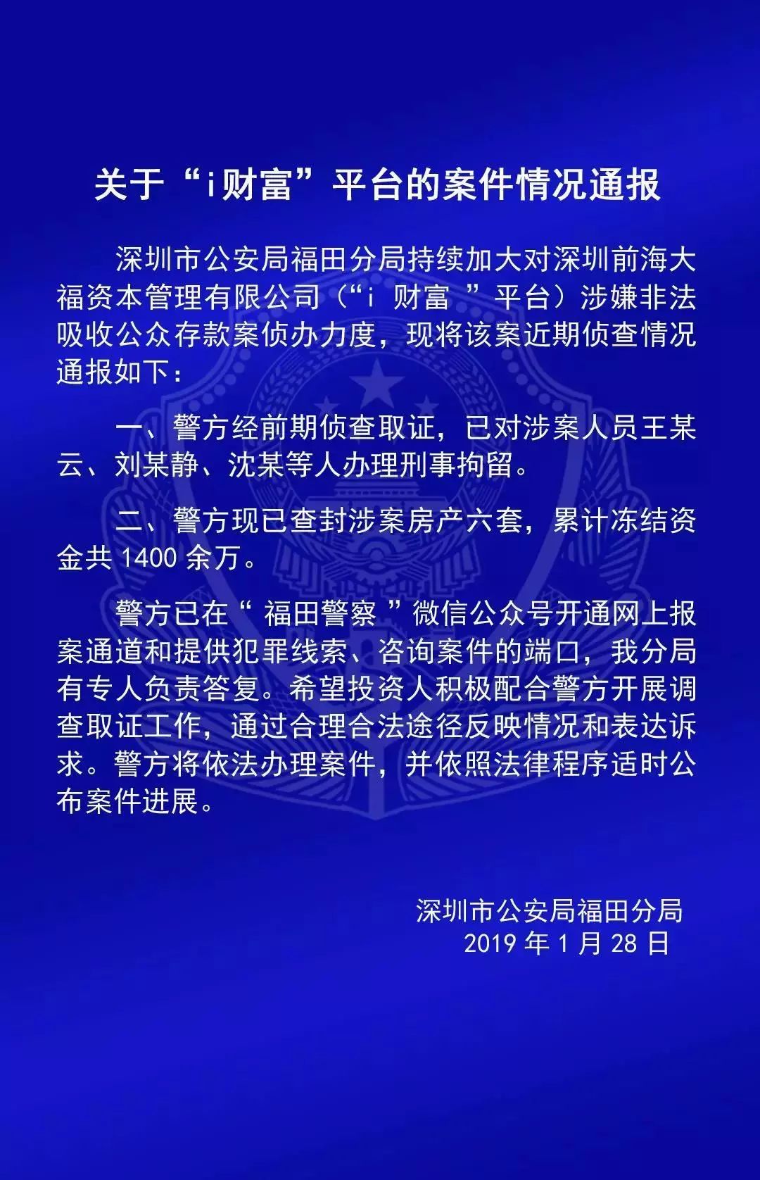 今日,深圳市公安局福田分局通过“福田警察”微信公众号对外公布了关于“钱贷网”、“i财富”、“蜜蜂有钱”三家网贷平台案件情况通报。其中关于“i财富”这个平台,根据通报称,警方经前期侦查取证,已对涉案人员王某云、刘某静、沈某等人办理刑事拘留。同时,警方现已查封涉案房产6套,累计冻结资产共1400余万。