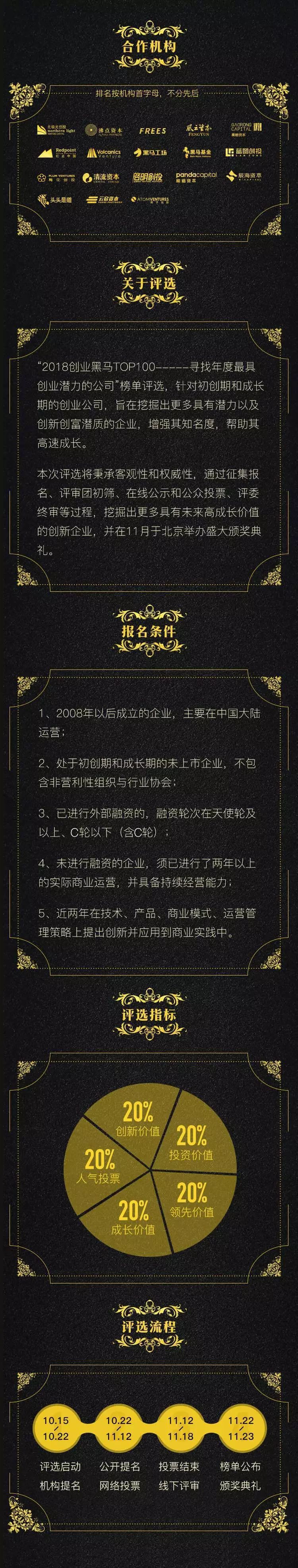 此次活动,黑马100联合了高榕资本、红点资本、启明创投等19个顶级投资机构共同推出,秉承客观性和权威性,通过征集报名、评审图初筛、在线公示和公众投票、评委终审等过程,旨在挖掘出更多具有未来高成长价值的创新企业。