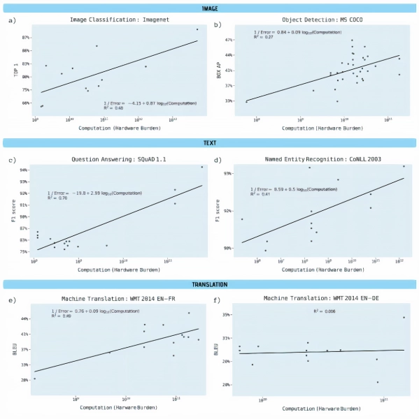 对象检测,命名实体识别和机器翻译对于硬件的负担大幅增加,而结果的改善却相对较小,计算能力解释了流行的开源ImageNet基准测试中图像分类精度差异的43%。