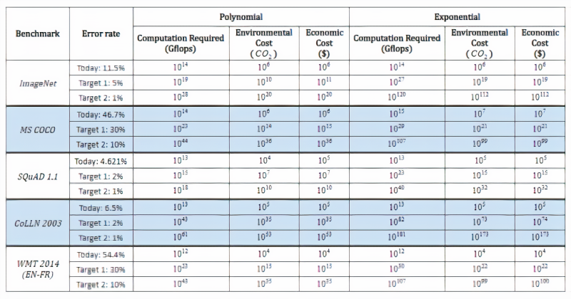 在研究过程中,研究人员还对预测进行了推断,以了解达到各种理论基准所需的计算能力以及相关的经济和环境成本。即使是最乐观的计算,要降低ImageNet上的图像分类错误率,也需要进行100000次以上的计算。