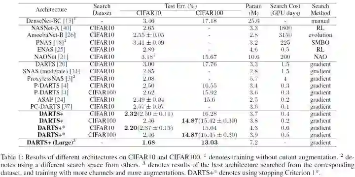DARTS+ 在原始 DARTS 算法基础上只需简单地加入一条早停机制,就可以在 CIFAR10、CIFAR100 和 ImageNet 上取得 2.32%、14.87% 和 23.7% 的错误率,超越一系列现有的 DARTS 改进算法,包括 SNAS[2]、P-DARTS[3]、XNAS[4]、PC-DARTS[5] 等。