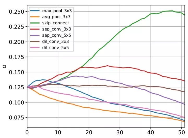 一旦前面的 cell 已经学到了不错的特征表达,而后面的 cell 学到的特征表达相对较差,那么后面的 cell 接下来会倾向于选择 skip-connect,来把前面 cell 已经学好的特征表达直接传递到后面。