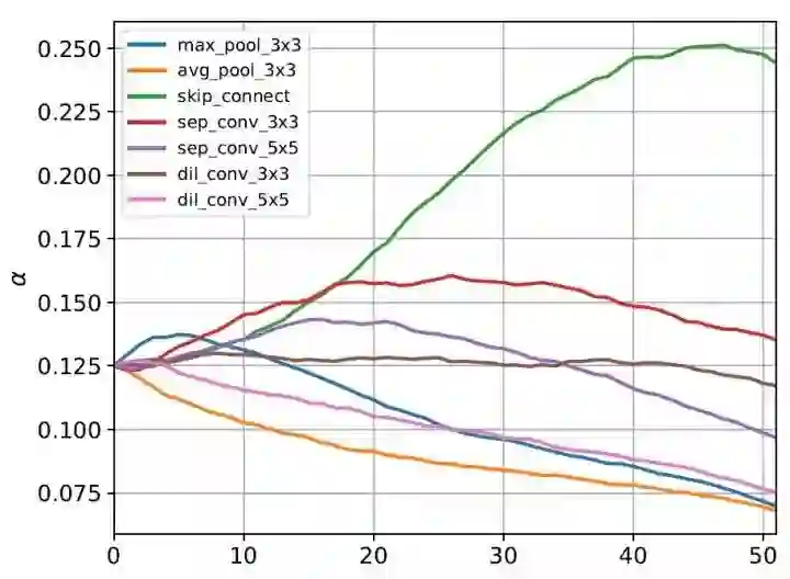 因此,在 DARTS 最后选出的网络架构中,skip-connect 的数量也会随着 search epoch 变大而越来越多,如下图中的绿线所示。