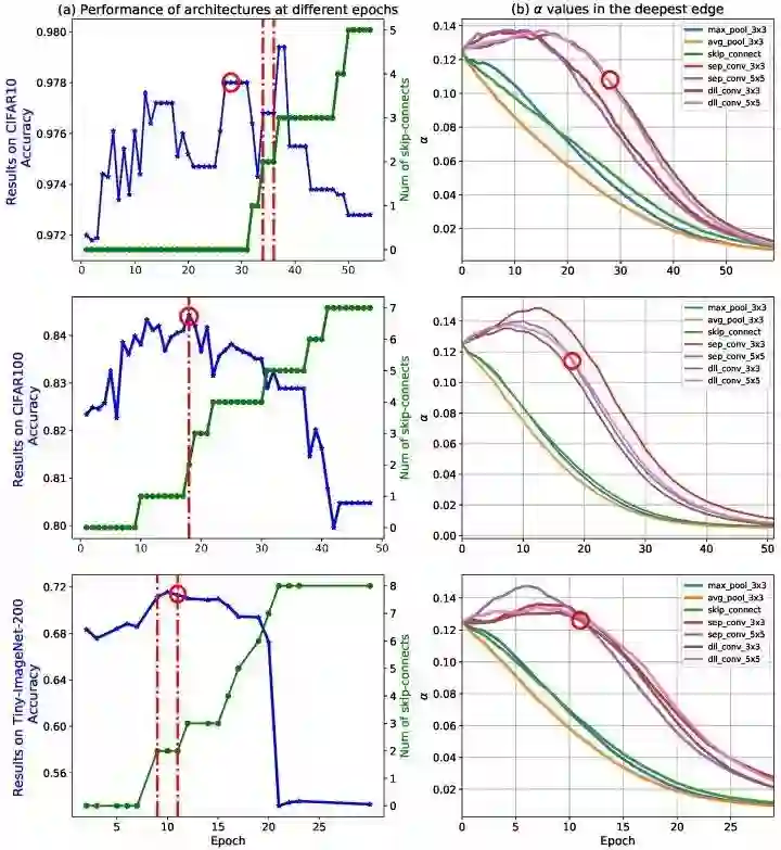 上图中的红圈代表各个可学习算子(比如卷积)的 alpha 排序不再改变的时间点(具体细节请参看原文)。