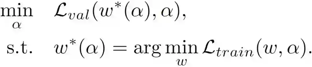 具体来说,DARTS 使用了如下的两层优化(Bi-Level Optimization)来搜索:
