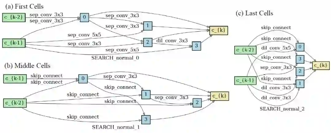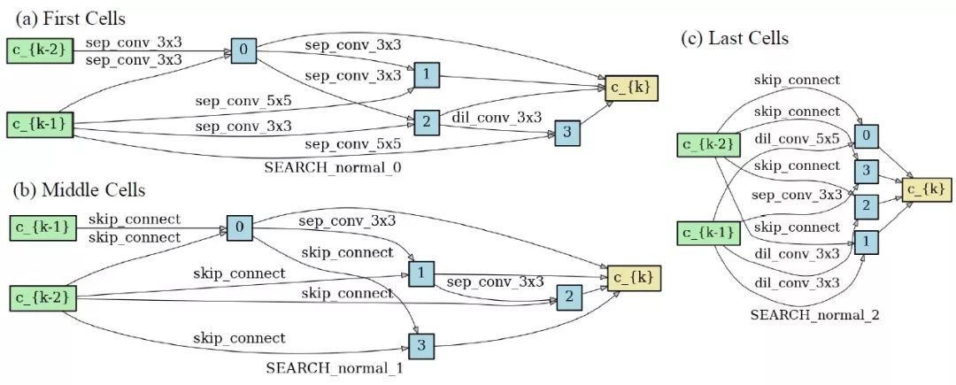 可以看到,前面的 cell 大部分都是卷积算子,而靠后的 cell 大部分都是 skip-connect。