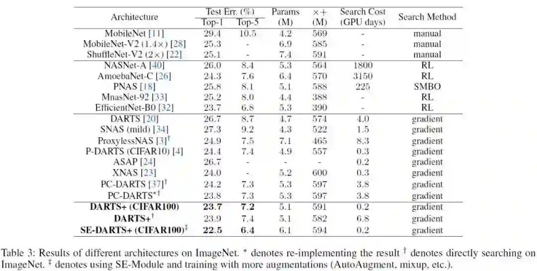 在模型大小相当的情况下,DARTS+ 可以达到与谷歌提出的 EfficientNet[6] 相同的性能,但是搜索时间却远远小于 EfficientNet,再叠加上一些常用的 tricks,在 ImageNet 上可以达到 22.5% 的错误率!