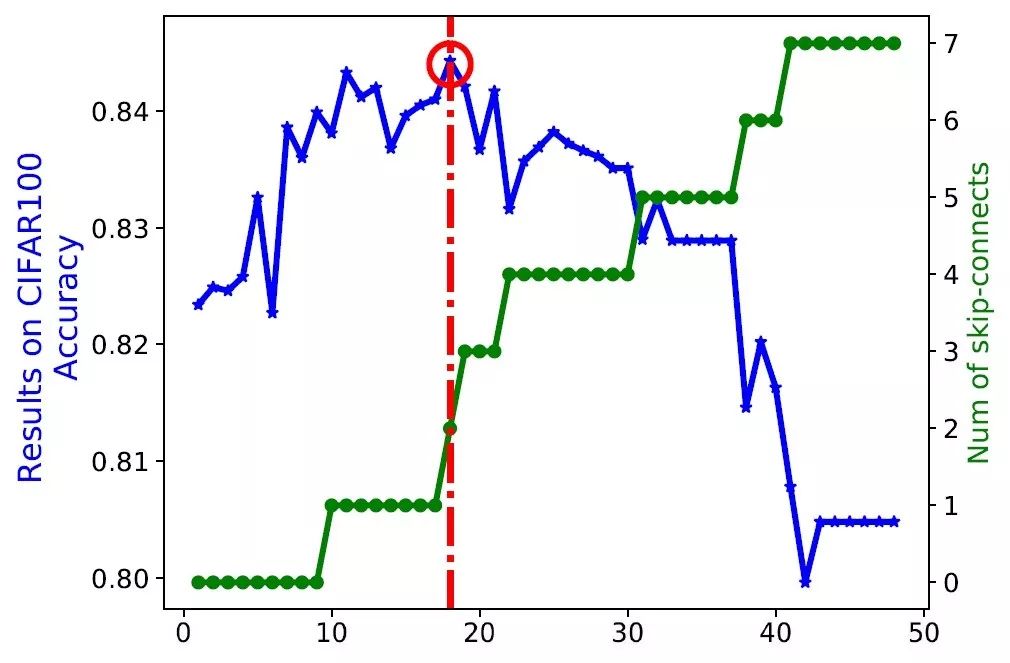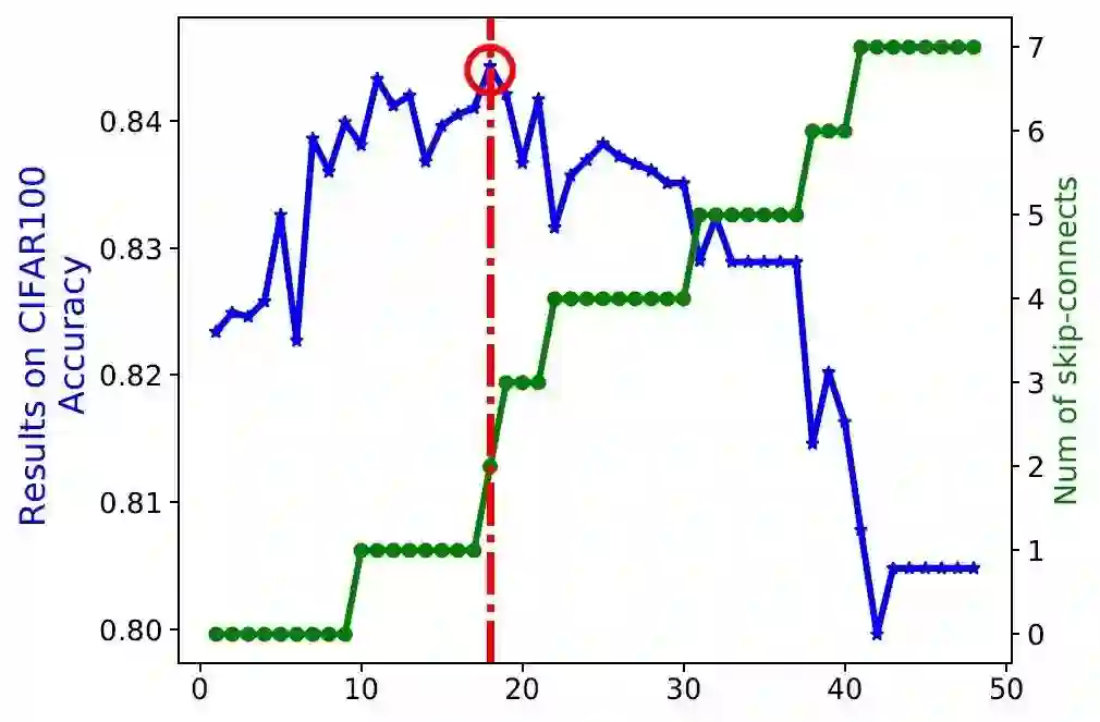 回到 DARTS 的设定,如果我们强制不同的 cell 共享同一个网络结构,那么 skip-connect 就会从后面的 cell 扩散到前面的 cell。