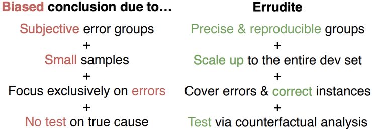 论文作者们也撰写了一篇介绍博客,根据通过一个具体的错误分析流程来说明当前基于一小批样本的手工、主观误差分析为什么容易得出模棱两可的、有偏倚的分析,并且可能弄错误差原因,以及如何借助 Errudite 避免这些错误。他们的论文中还有更多的例子。