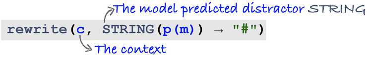 根据这个领域专用语言,Errudite 可以按一定的规则重写分组内的所有实例。比如在这里,为了验证干扰词是否是根本原因,根据重写规则把文本中的干扰词都替换成无意义的占位符「#」,这样就不会再被检测为实体。