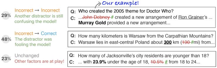 对于分组中的其它样本,有 29% 的情况模型会给出另一个不正确的同类型实体(另一个干扰词);在 48% 的情况中,模型给出了正确的预测,这部分样本里确实是干扰词带来了错误预测;在剩下的 23% 中,模型给出了和之前相同的预测 —— 只不过由于现在那些字符已经被「#」替换,所以模型的预测结果就会包含这个没有任何实际含义的「#」字符!可以猜测这可能是因为问题和预测答案高度重合,所以模型实际做的更接近于直白的字符匹配而不是寻找实体。从这种反事实分析中得到的结论就不是仅仅做一下分组就能得到的了。