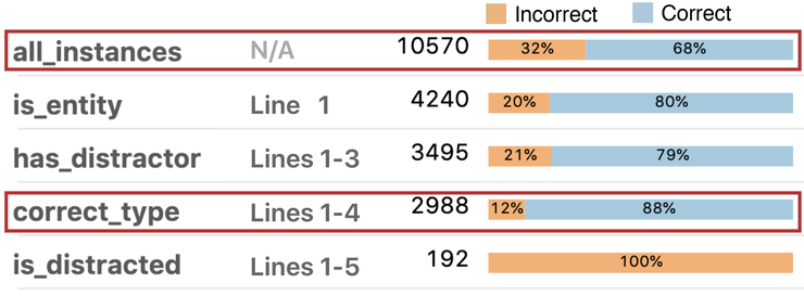 不过,当我们执行了所有步骤中的过滤器、构建出了详尽的分组以后,我们其实会发现全新的图景:对于全部样本,BiDAF 能给在 68% 的样本中给出正确的实体;对于标准答案就是一个实体的样本,模型的准确率会提高到 80%;当文本中有同一个类型的其它实体的时候,BiDAF 的准确率仍然有 79%;让它预测一个类型正确的实体的时候,它的准确率高达 88%,要比全部样本的正确率高得多。这意味着,对于实体类型匹配、且有干扰词出现的情况,模型的表现还是比整体表现要好,这种情况并不是模型表现的短板。所以,如果你只是发现了有某种错误出现,然后就决定要先解决这种错误的话,你可能需要重新考虑一下,因为你很可能忽视了模型表现非常糟糕的情境。