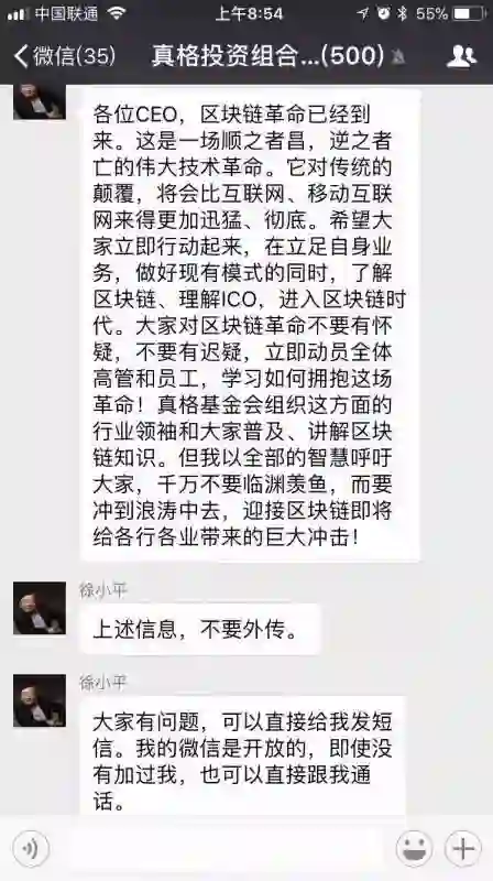 著名投资人徐小平在被投企业微信群中,提示大家区块链革命已经到来。