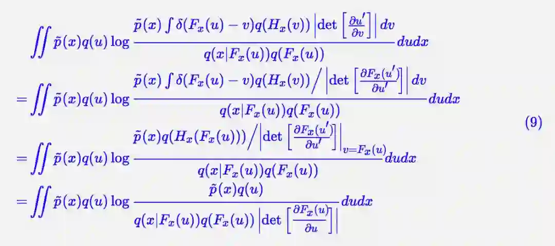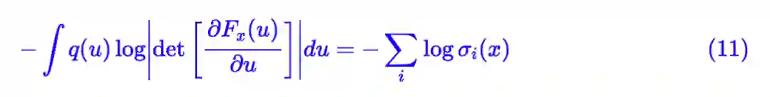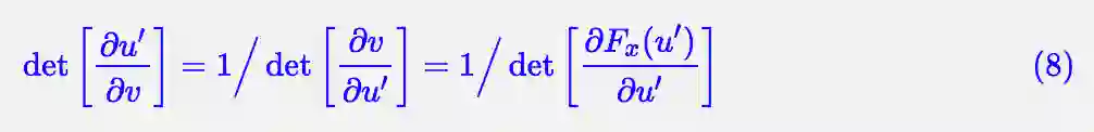 这里 q(u) 是标准高斯分布,Fx(u) 是关于 x,u 的二元函数,但关于 u 是可逆的,可以理解为 Fx(u) 是关于 u 的流模型,但它的参数可能跟 x 有关,这里我们称为“条件流”。代入 (4) 计算得到: