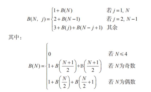 现在,只要算出B(N)即可,也就是说,总共有N个位置且两端已被占时,达到饱和所需人数。N≤4时,两端被占即饱和,此时B(N)=0。N>4时,第一人可以选中间位置,即位置(N+1)/2(N为奇数)或N/2(N为偶数)。如上文所述,3人形成新的分区:左边从第一个位置到中间,还可再有B((N+1)/2)或B(N/2)人(N为奇数或偶数);右边从中间到最后位置,还可再有B((N+1)/2)或B(N/2+1)人(N为奇数或偶数)。