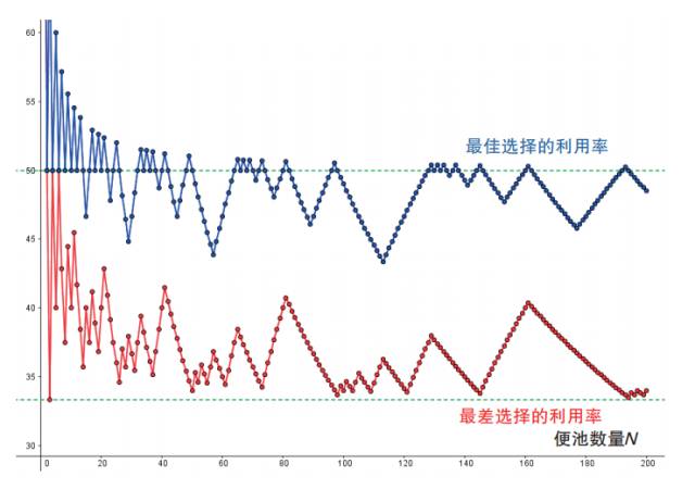函数A和B都以递归形式定义,不到一杯啤酒的时间就能在手机上编个小程序算出来。函数B可简化为单一表达式(包含一堆对数和各种因式),但至今无法直接算出令A(N, j)最大的j值。对于给定的N值,可算出所有j值对应的A(N, j),由此可以看出,最后位置并不总是最好的选择(表20.1),并且便池利用率最高可达50%(一半便池被占用),而最低只有33%(图20.5)。