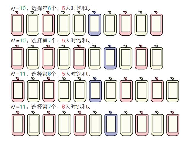 N为偶数时,你可以随意选择,饱和所需人数一样。比如,N=10时,不管选择第6个或第7个(蓝紫色),都要再有4人(粉红色)才饱和。另外要注意的是,如果选择第6个,则第4个和第5个半孤立,第6人进来应会选择二者之一。N为奇数时,应选奇数位小便器。比如一共有11个位置时,假如选择第7个的话,则还可容纳5人,选择第6个,就只能再容纳4人。