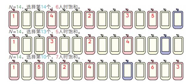 如果第一人选择最后的位置,再来5人饱和。如果他选择第10个位置,则再来6人才饱和,可记为A(14,14)=6,A(14,13)=5,A(14,10)=7。