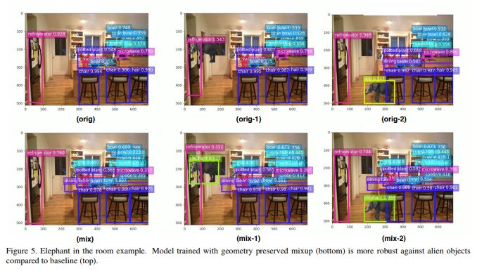 为了证明mixup的视觉效果,作者做了前段时间比较有意思的大象贴图实验,如Figure5所示,第一行使用常规的训练方式训练YOLO v3模型,第二行则是采用mixup方式训练YOLO v3模型,可以看出后者能够有效检测到图像贴上的大象(mix-1和orig-1的对比),不过在orig-2和mix-2的对比中,二者都能检测到大象,这一点在文中没有做详细的解释。