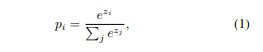 其中qi表示真实标签,pi是预测值,因为q是one-hot形式(假设分类类别数是K,那么q就是1×K的向量,且其中只有对应的真实类别位置是1,其余都为0)。pi的计算公式如下,这是常见的softmax函数,假设真实类别是i,那么模型训练过程中会不断使得zi远大于zj,这样pi就越接近1,这样公式2中的L就越接近0,虽然这是训练目标,但训练过程越趋近于这种情况,反而是越容易过拟合的。