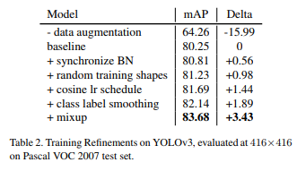 实验部分采用的模型包括YOLO v3和Faster RCNN,数据集部分采用PASCAL VOC和COCO。Table2是优化的YOLO v3模型在VOC2007测试集上的效果提升对比。