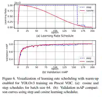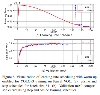 学习率变化采用cosine函数且增加warm-up,这部分内容可以直接看Figure6。图中(a)是常见的step修改策略和cosine修改策略+warm-up的学习率变化对比图,可以看到cosine在初始和结束阶段的变化都比较缓慢,在中间部分变化相对快一些,整体而言相比step方式变化会更加平稳一些,这种方式有利于训练过程的稳定,包括warm-up的引入,也是为了训练的起始阶段能够更加稳定地进行。