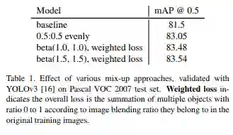 针对mixup作者做了不同参数设置下的实验效果对比,如Table1所示,这里涉及一个名词:weighted loss,在图表中也做了解释,因为模型训练用的图像来自2张原输入图像通过不同权重合并得到的(如Figure3所示),因此在计算损失函数时(损失函数是基于目标计算的),属于不同输入图像的目标的权重也是不一样的,需要和输入图像在合并时的权重对应。而Table5中第二行的0.5:0.5 evenly表示合成是按照0.5和0.5的权重进行,因此最后计算损失时目标的权重也相等。