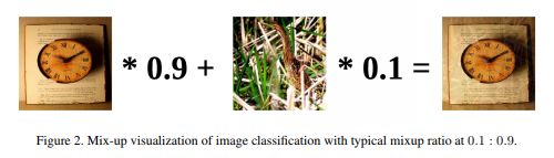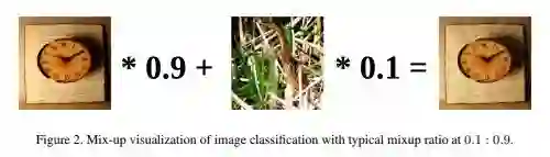 mixup是指将2张输入图像按照一定权重合并成一张图像,基于这种合成图像进行训练的模型更加鲁棒,能够有效降低对抗图像的影响。如图Figure2是在分类算法中使用mixup的例子: