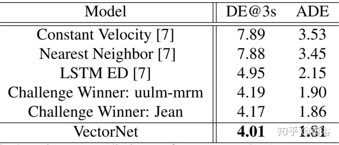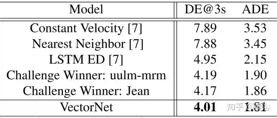 下表是一些结果比较:基线方法包括恒速运动、最近邻检索和LSTM编码器/解码器。其性能击败了目前最好的方法,Argoverse预测挑战赛的冠军(evalai.cloudcv.org/web/)。