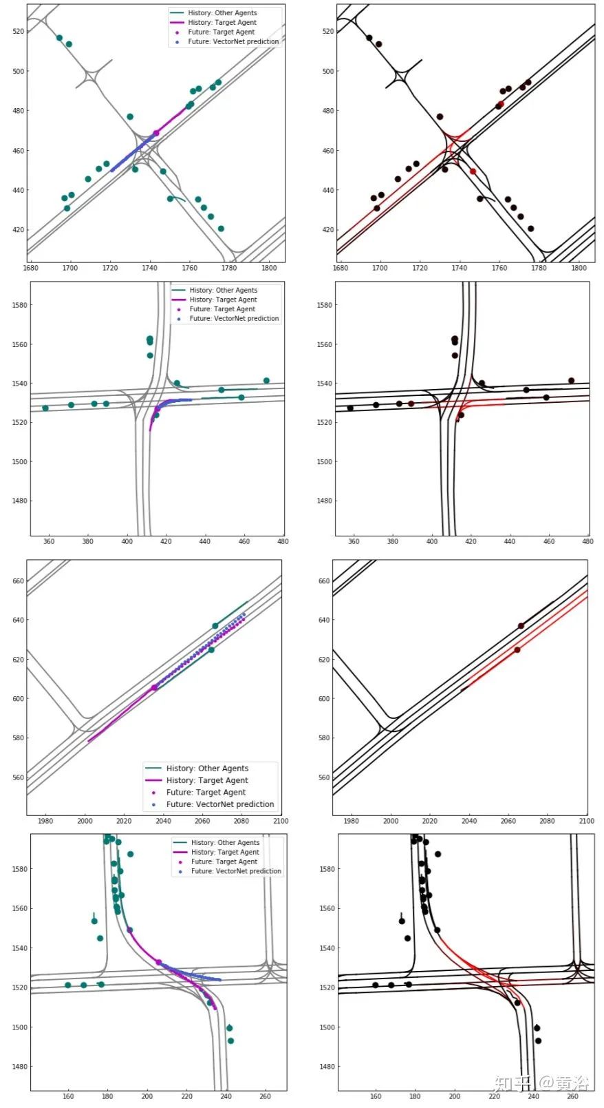 如图是结果展示:左图是预测(prediction)可视化,右图是对道路和代理的注意(attention)可视化。