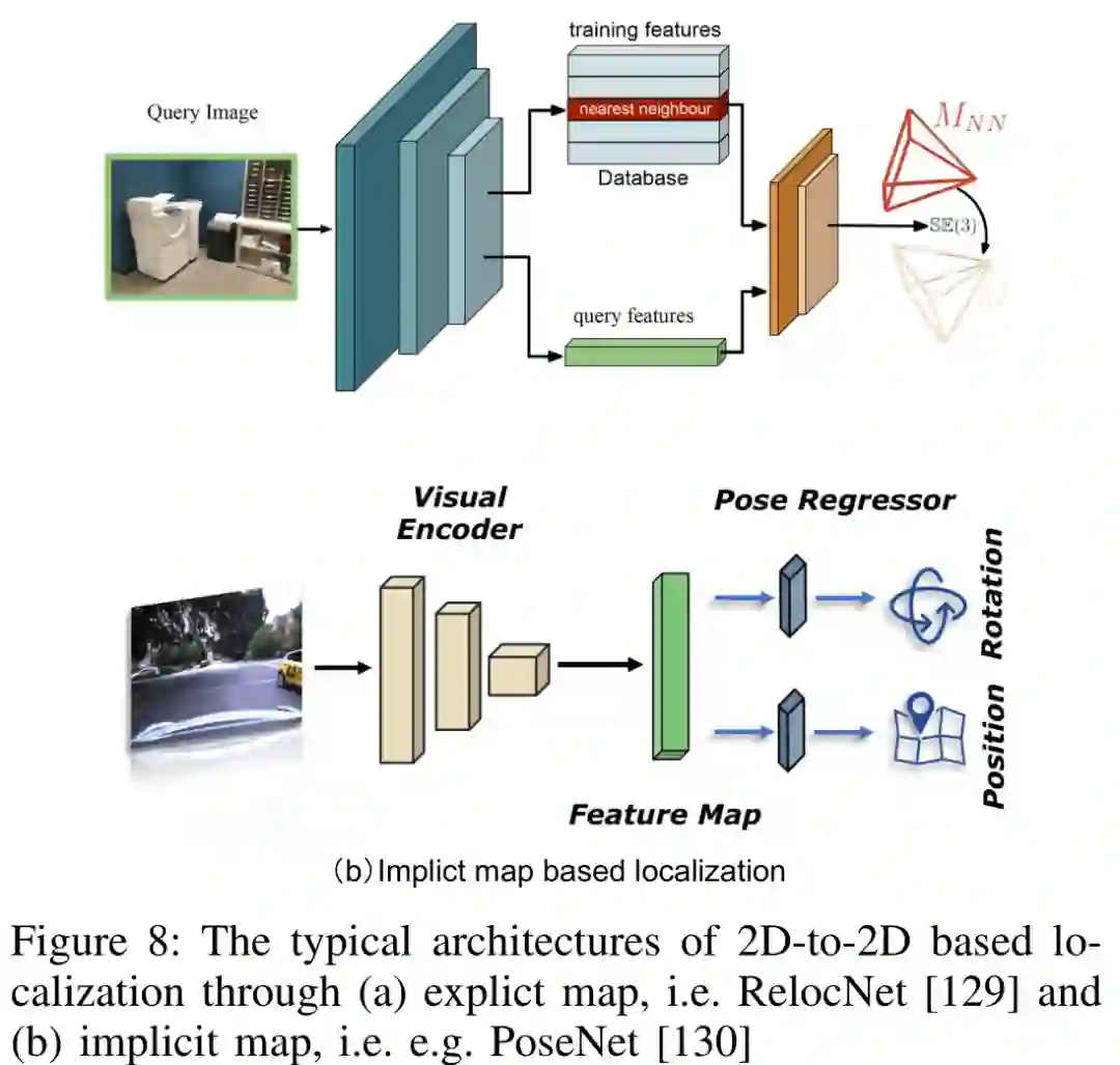 基于显式地图的2D到2D定位通常通过一个带有地理标记的图像数据库来表示场景(参考文献[152],[153],[154]。图8(a)说明了使用二维参考图像进行定位的两个阶段:图像检索用于确定参考图像表示场景中与视觉查询值最相关的部分;位姿回归用于获得查询图像相对于参考图像的相对位姿。