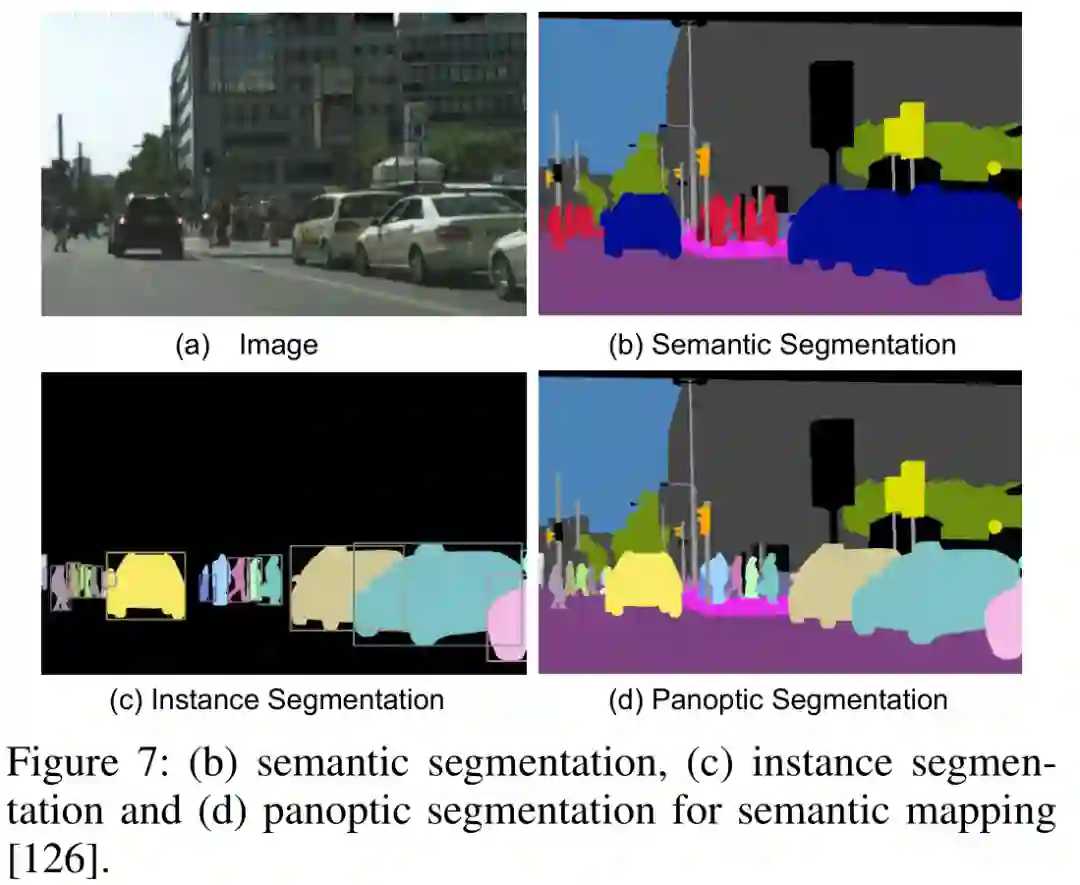 图7:(b)语义分割,(c)实例分割,(d)语义建图的全景分割[126].