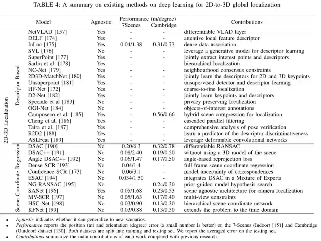 表四:现有的基于深度学习的2D到3D全局定位方法综述
