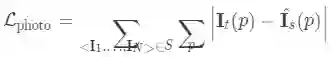 其中,K是相机内参矩阵,为相机从目标帧到源图像帧的运动矩阵,{t}\left(p_{t}\right)表示目标帧中的每像素的深度图。训练目标是通过优化真实目标图像和合成目标图像之间的光度重建损失来保证场景几何的一致性: