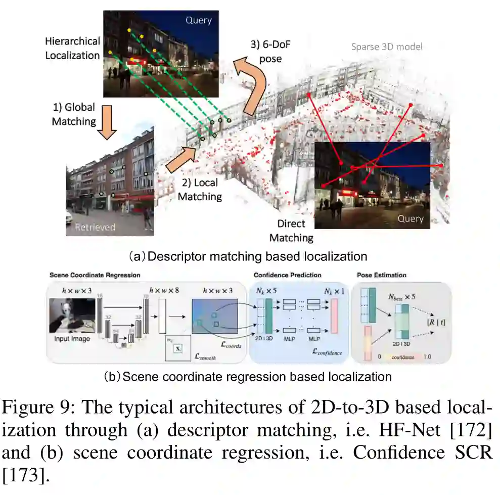 图9:通过(a)描述子匹配,即HF-Net[172]和(b)场景坐标回归,即Confidence SCR,实现基于2D 到 3D定位的典型架构[173].