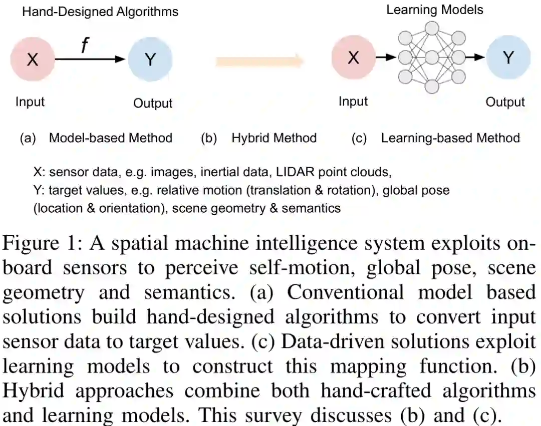 图1:空间机器智能系统利用机载传感器感知自我运动,全局位姿,场景几何和语义信息。(a)传统的基于模型的解决方案是建立人工设计的算法,将输入的传感器数据转换为目标值。(c)数据驱动的解决方案是利用学习模型来构造这种映射函数。(b)混合方法结合了人工制作的算法和学习模型。本篇综述主要讨论了(b)和(c)两种类型的方法。