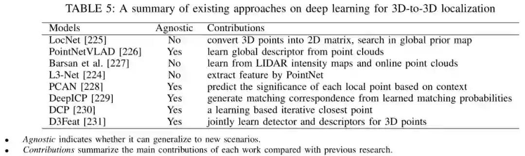 通过将激光雷达定位定义为递归贝叶斯推理问题,[227]将激光雷达强度地图和在线点云扫描嵌入到共享空间中,以实现完全可微的位姿估计。LocNet[225]没有直接对三维数据进行操作,而是将点云扫描转换为二维旋转不变性表示,用于搜索全局先验地图中的相似帧,并执行迭代最近点(ICP)的方法来计算全局位姿。为了提出一个直接处理点云的基于学习的激光雷达定位框架,L3-Net[224]使用PointNet[125]处理点云数据,以提取某些有用的特征描述子,并通过递归神经网络对运动动力学的时间连接进行建模。它通过最小化点云输入与三维地图的匹配距离,优化了预测位姿与真值之间的损失。一些技术,如Point NetVLAD[226]、PCAN[228]和D3Feat[231]在开始时尝试了检索参考场景,而其他技术如DeepICP[229]和DCP[230]允许从三维扫描中估计相对运动变换。与基于图像的重定位(2D-to-3D和2D-to-2D)相比,对于3D到3D的定位方面的研究相对较少。