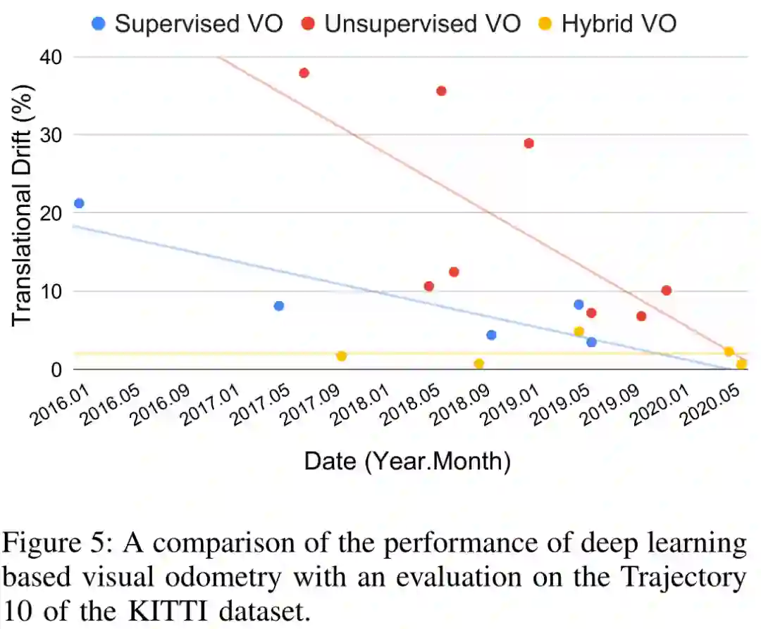 我们以视觉里程计为例。图5展示了深度视觉里程计模型在KITTI数据集10号轨迹上随时间变化的位移漂移。显然,混合VO比有监督VO和无监督VO表现出了更好的性能,因为混合VO既有传统VO算法成熟的几何模型,又有强大的深度学习特征提取能力。虽然有监督VO仍然优于无监督VO,但是随着无监督VO的局限性逐渐得到解决,它们之间的性能差距会逐渐缩小。例如,(研究人员)目前已经发现无监督VO可以从单目图像中恢复全局尺度[30]。总体而言,数据驱动的视觉里程计显示出的模型性能正在显著提高,这表明了深度学习方法在未来实现更精确的里程计估计的潜力。