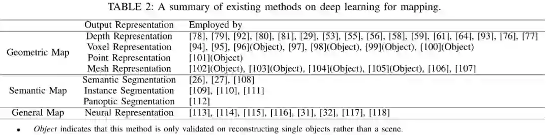 建图是指移动机器人构建一致的环境模型来描述周围场景的能力。深度学习生成了一套用于场景感知和理解的工具,应用范围从深度预测到语义标记,再到三维几何重建。本节概述了与现有的基于深度学习建图方法相关的工作。我们将它们分为几何映射、语义映射和一般映射。表2总结了现有的基于深度学习的地图绘制方法。