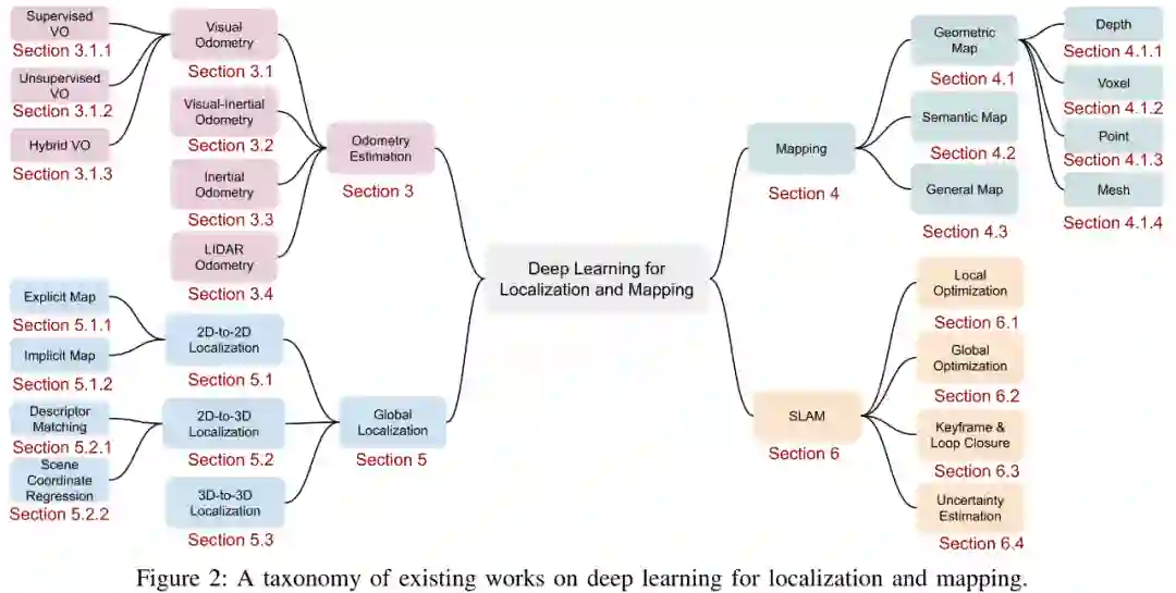 我们为现有的与定位和建图相关,连接机器人、计算机视觉和机器学习等领域的深度学习方法提供了一种新的分类方式。大致可以分为里程计估计、建图、全球定位和SLAM,分类形式如图2所示: