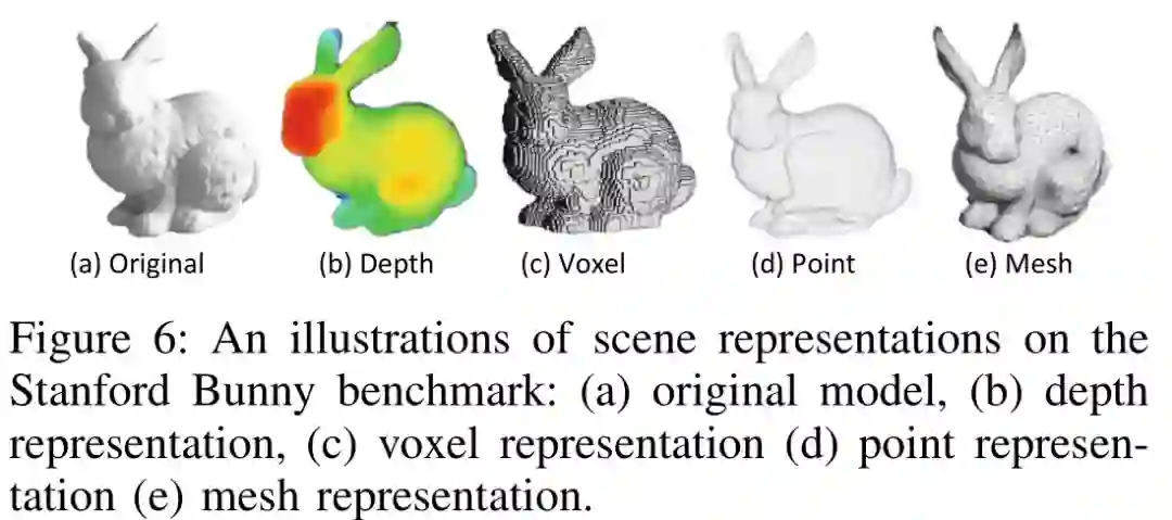 图6:斯坦福兔基准测试中的场景表示示意图:(a)原始模型,(b)深度表示,(c)体素表示,(d)点表示,(e)网格表示。
