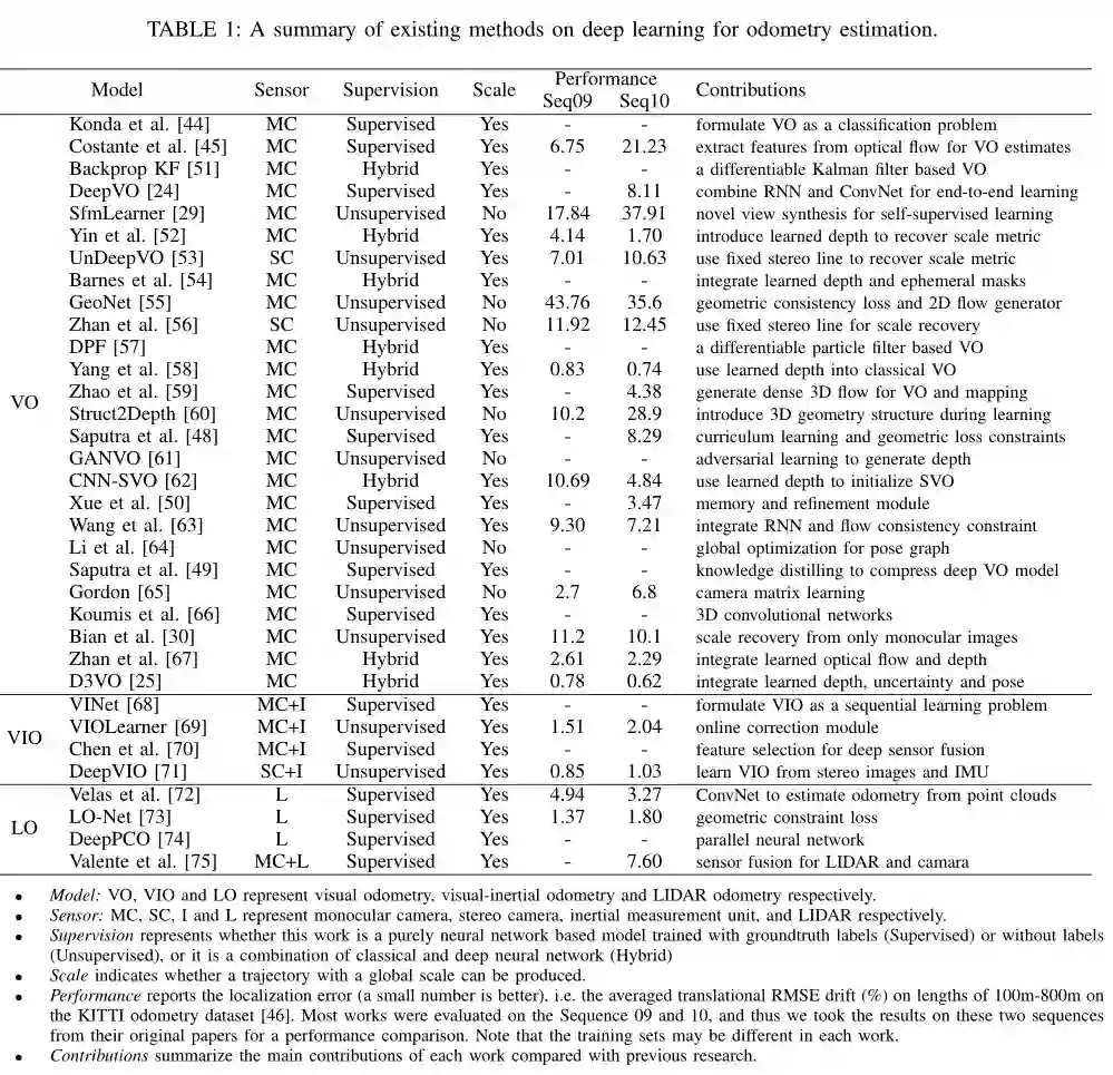结合几何理论和深度学习的优点,混合模型在现阶段通常比端到端VO更精确,如表1所示。值得注意的是,混合模型的性能甚至超过了目前最先进的传统单目VO或视觉惯导里程计(VIO)系统,例如,D3VO[25]击败了几个热门的传统VO/VIO系统,如DSO[84]、ORB-SLAM[21]、VINS Mono[15]。这表明了这一领域的迅速发展。
