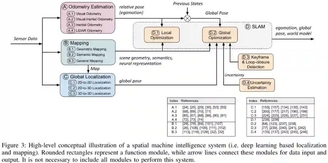 尽管各个组件的设计目标不同,但上述组件可以集成到空间机器智能系统(SMIS)中,以解决现实世界中的挑战,从而实现鲁棒的操作和在野外的长期自主能力。图3显示了基于深度学习的集成定位和建图系统的概念图,以及这些组件之间的关系。在下面的部分中,我们将详细讨论这些组件。