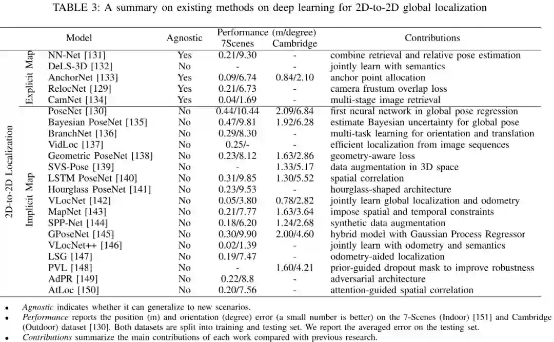 根据查询数据和地图的类型,我们将基于深度学习的全局定位分为三类:2D到2D的定位根据地理参考图像的显式数据库或隐式神经网络图查询二维图像;2D到3D的定位建立了图像的二维像素和场景模型三维点之间的对应关系;3D到3D的定位将三维扫描与预先构建的三维地图进行了匹配。表3、表4、表5分别总结了现有的基于深度学习的2D到2D,2D到3D,3D到3D的全局定位方法。