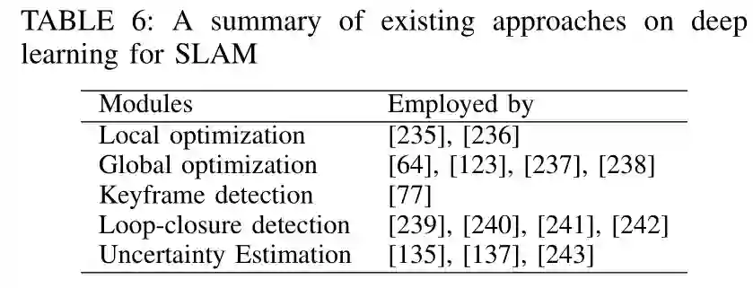 同时跟踪自运动并估计周围环境的结构,构成了一个同时定位与建图(SLAM)系统。上述章节中讨论的定位和建图的各个模块可以看作是一个完整的SLAM系统的各个模块。本节概述了使用深度学习的SLAM系统,主要关注有助于SLAM系统集成的模块,包括局部/全局优化、关键帧/回环检测和不确定性估计。表6总结了本节讨论的现有的基于深度学习的SLAM方法。